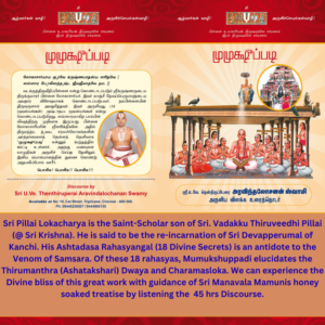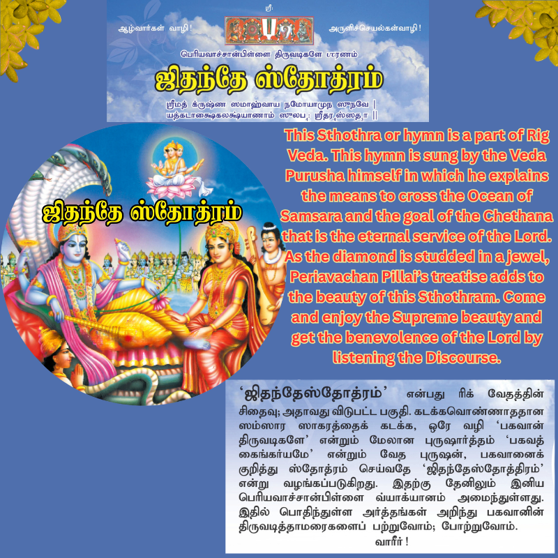 This Sthothra or hymn is a part of Rig Veda. This hymn is sung by the Veda Purusha himself in which he explains the means to cross the Ocean of Samsara and the goal of the Chethana that is the eternal service of the Lord. As the diamond is studded in a jewel, Periavachan Pillai’s treatise adds to the beauty of this Sthothram. Come and enjoy the Supreme beauty and get the benevolence of the Lord by listening the Discourse.