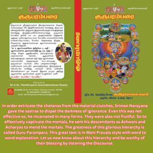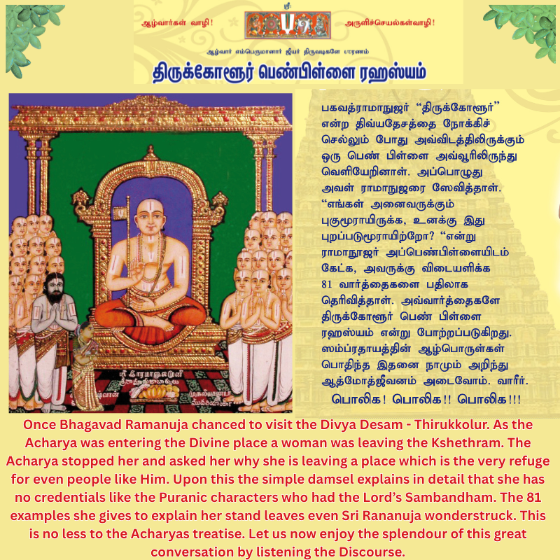 Once Bhagavad Ramanuja chanced to visit the Divya Desam – Thirukkolur. As the Acharya was entering the Divine place a woman was leaving the Kshethram. The Acharya stopped her and asked her why she is leaving a place which is the very refuge for even people like Him. Upon this the simple damsel explains in detail that she has no credentials like the Puranic characters who had the Lord’s Sambandham. The 81 examples she gives to explain her stand leaves even Sri Rananuja wonderstruck. This is no less to the Acharyas treatise. Let us now enjoy the splendour of this great conversation by listening the CD.
